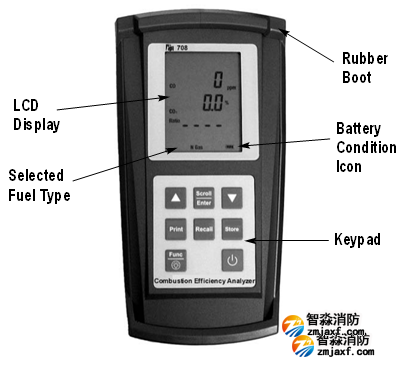 Func功能鍵用于選擇708的功能模式,讓您可以設(shè)定708作為一個(gè)燃燒分析儀,壓力表,溫度計(jì),或可燃檢漏儀。此外,該功能鍵可用來訪問日期/和時(shí)間顯示。有關(guān)功能鍵的更多信息見第6條,
